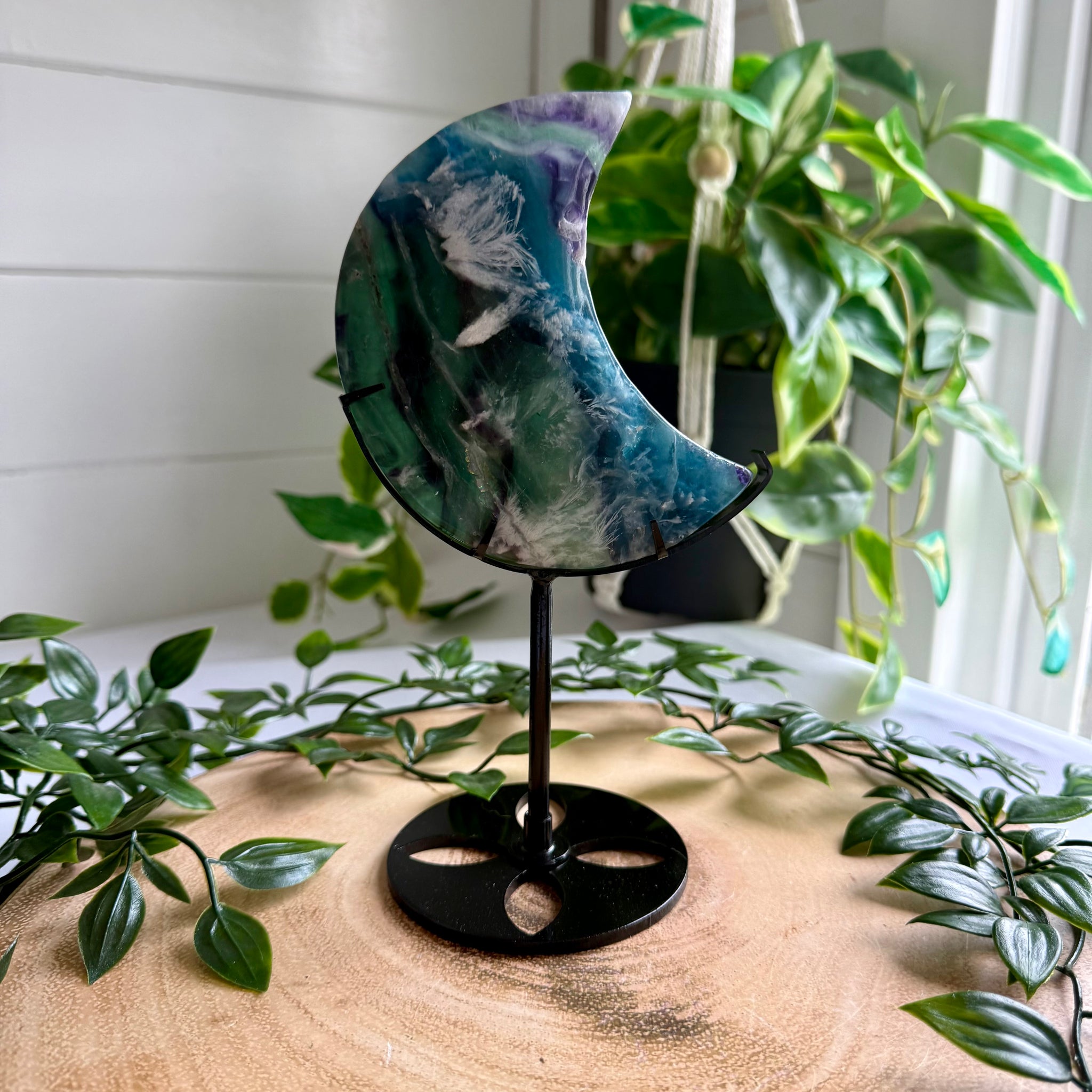 Beautiful Green, Purple and Blue Feather Fluorite Moon on custom black stand. Also known as Snowflake Fluorite.