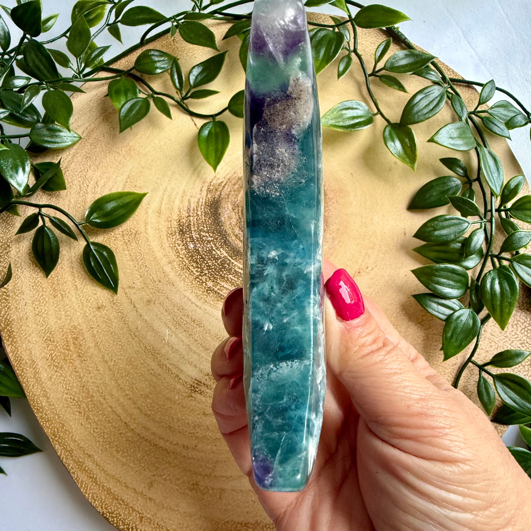 Feather Fluorite is a type of Fluorite distinguished by its beautiful inclusions. These inclusions are actually a different mineral called Scolecite, which crystallises within the Fluorite in a delicate, feathery pattern. This distinctive feature gives the stone its name.