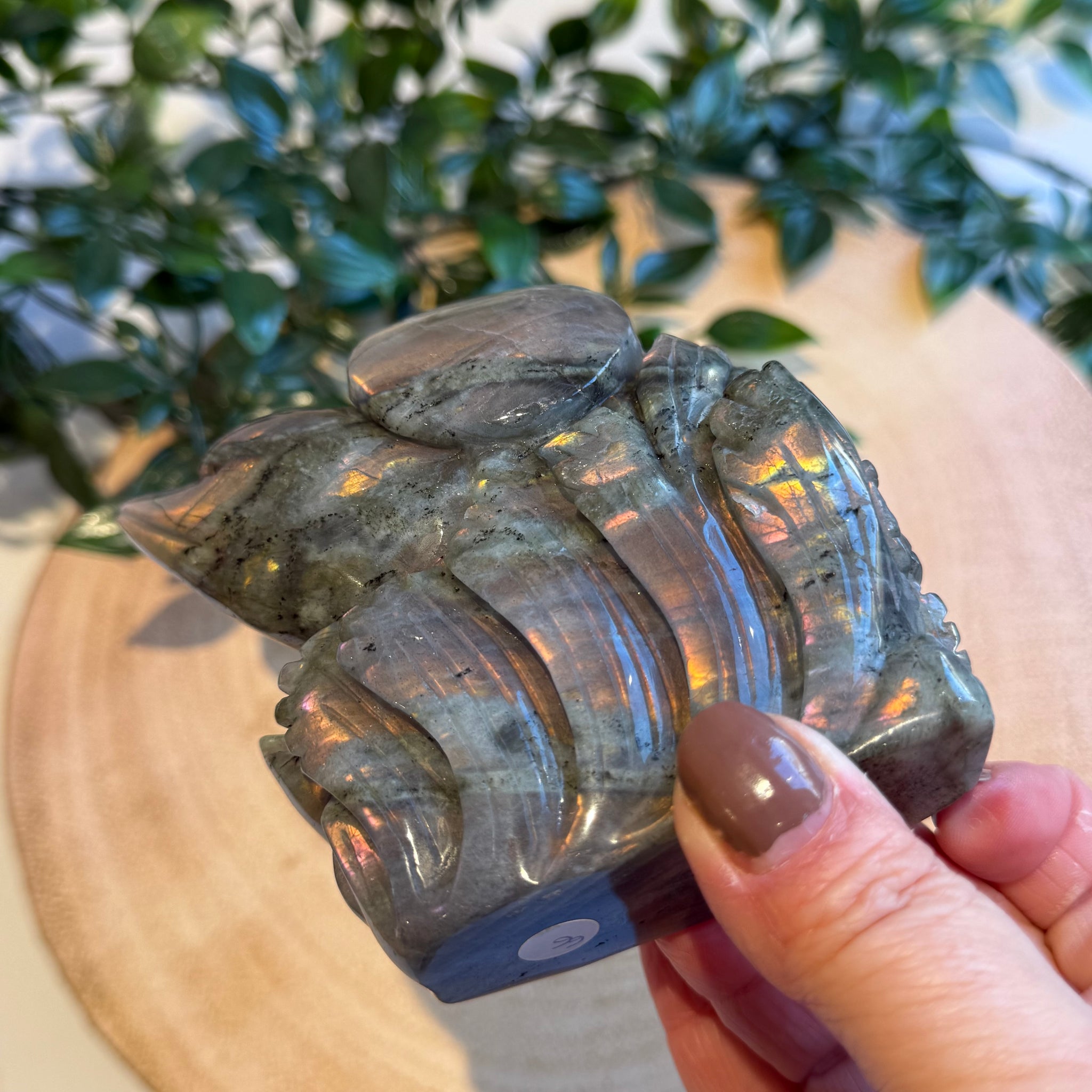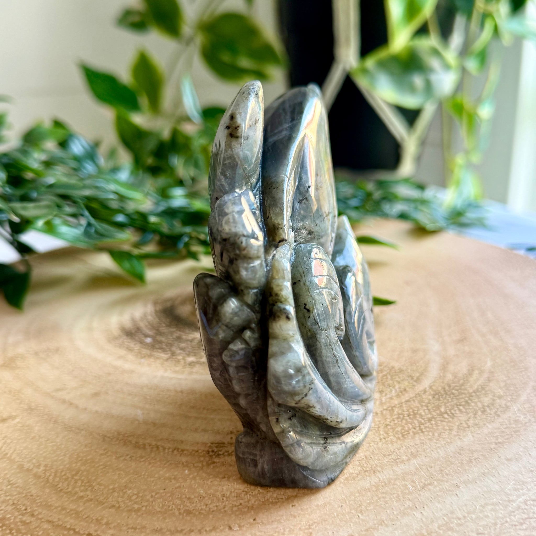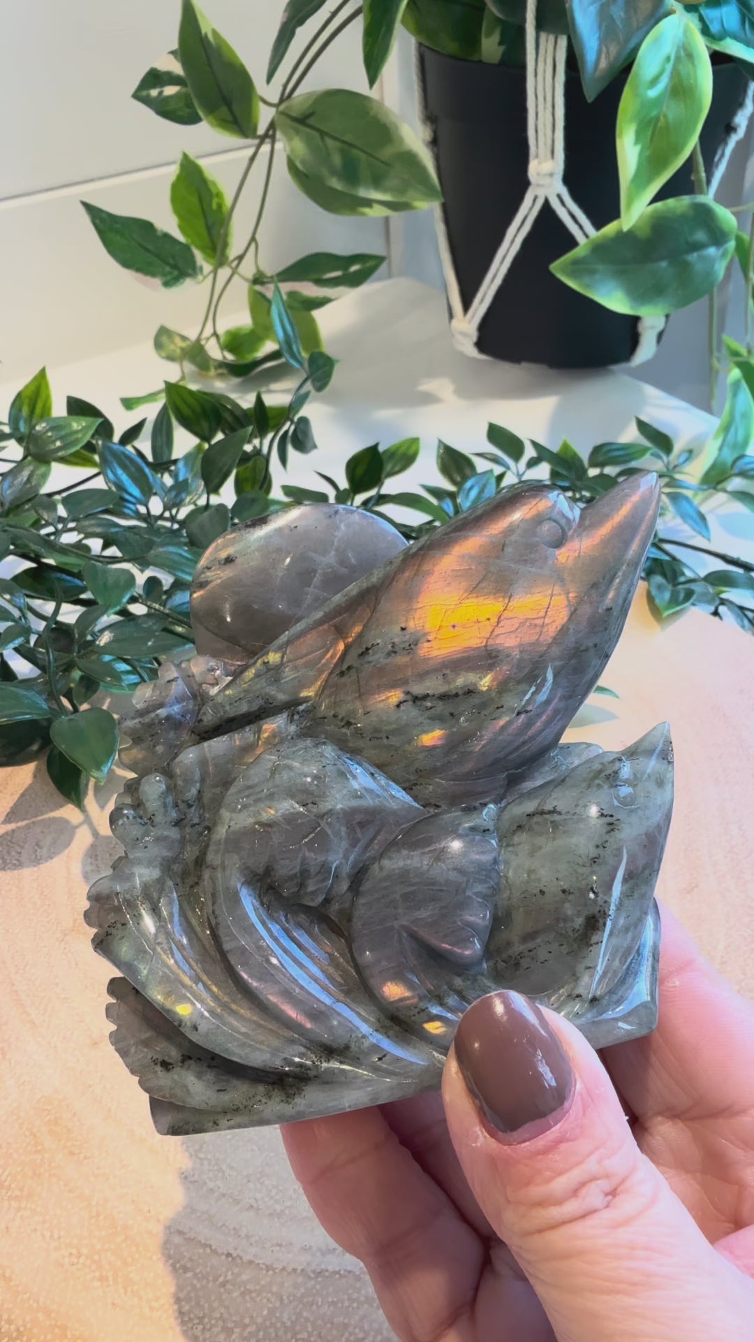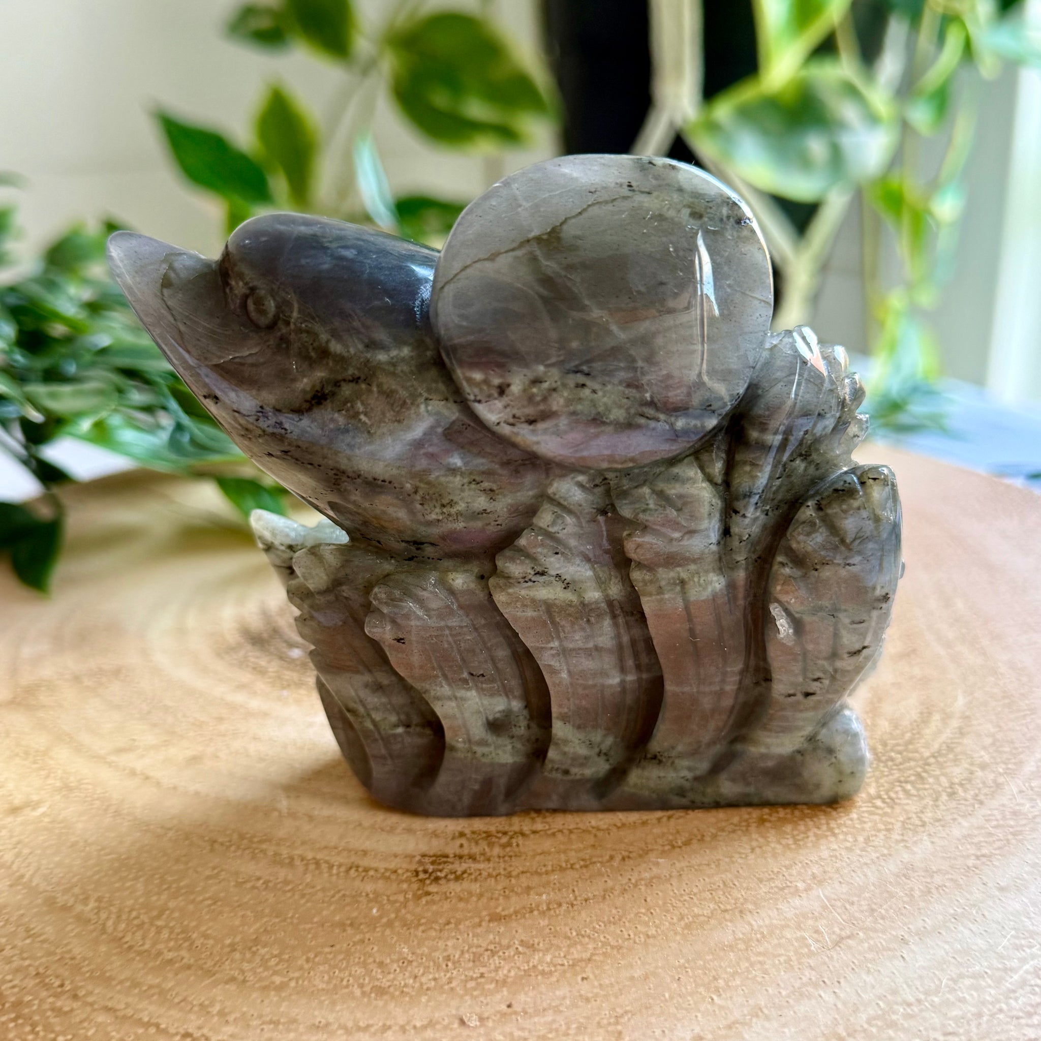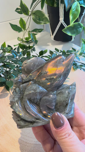 This is a beautiful flashy Labradorite carving of two dolphins jumping out of the water.