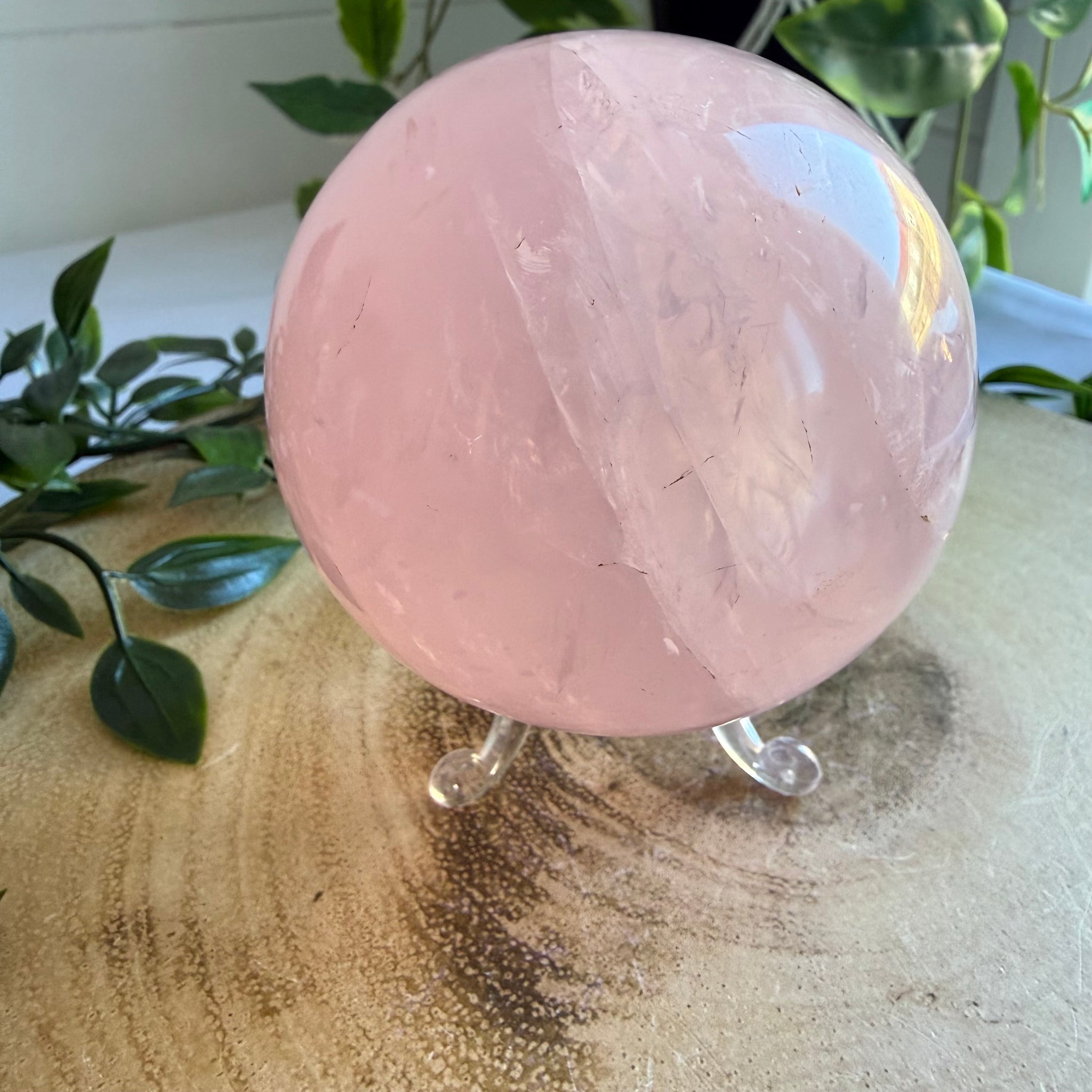 This is a beautiful 8cm diameter Rose Quartz Sphere from Madagascar. This sphere also has Asterisms but I am unable to capture it in the natural light.